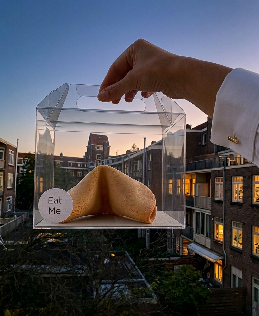 Working closely with the pastry department of Hotel Okura, the recipe was developed and refined for both flavour and structural integrity. The cookie functioned not only as a carrier of text, but as a sensory trigger, activating taste, scent and touch.